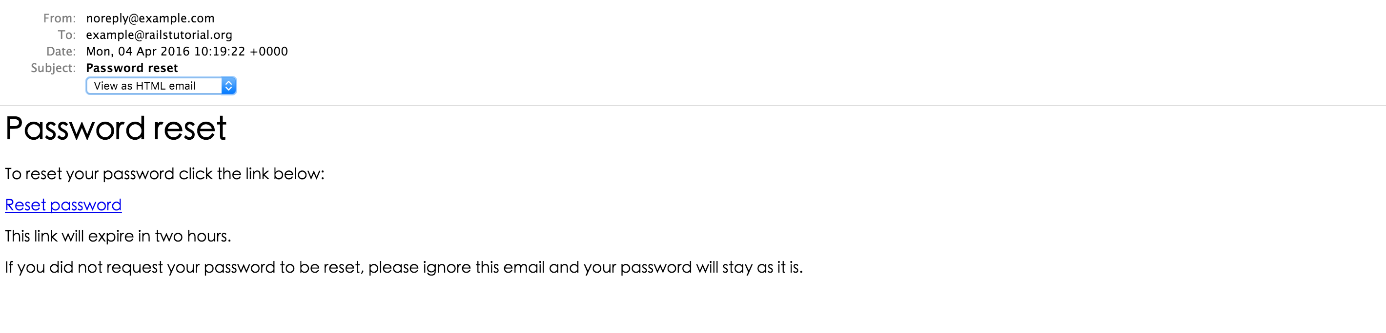 重設密碼的郵件的運作方式其實幾乎跟帳號啟動一樣,我們先在 UserMailer 建立一個 password_reset 方法,然後定義純文字和 HTML email 的 view template: