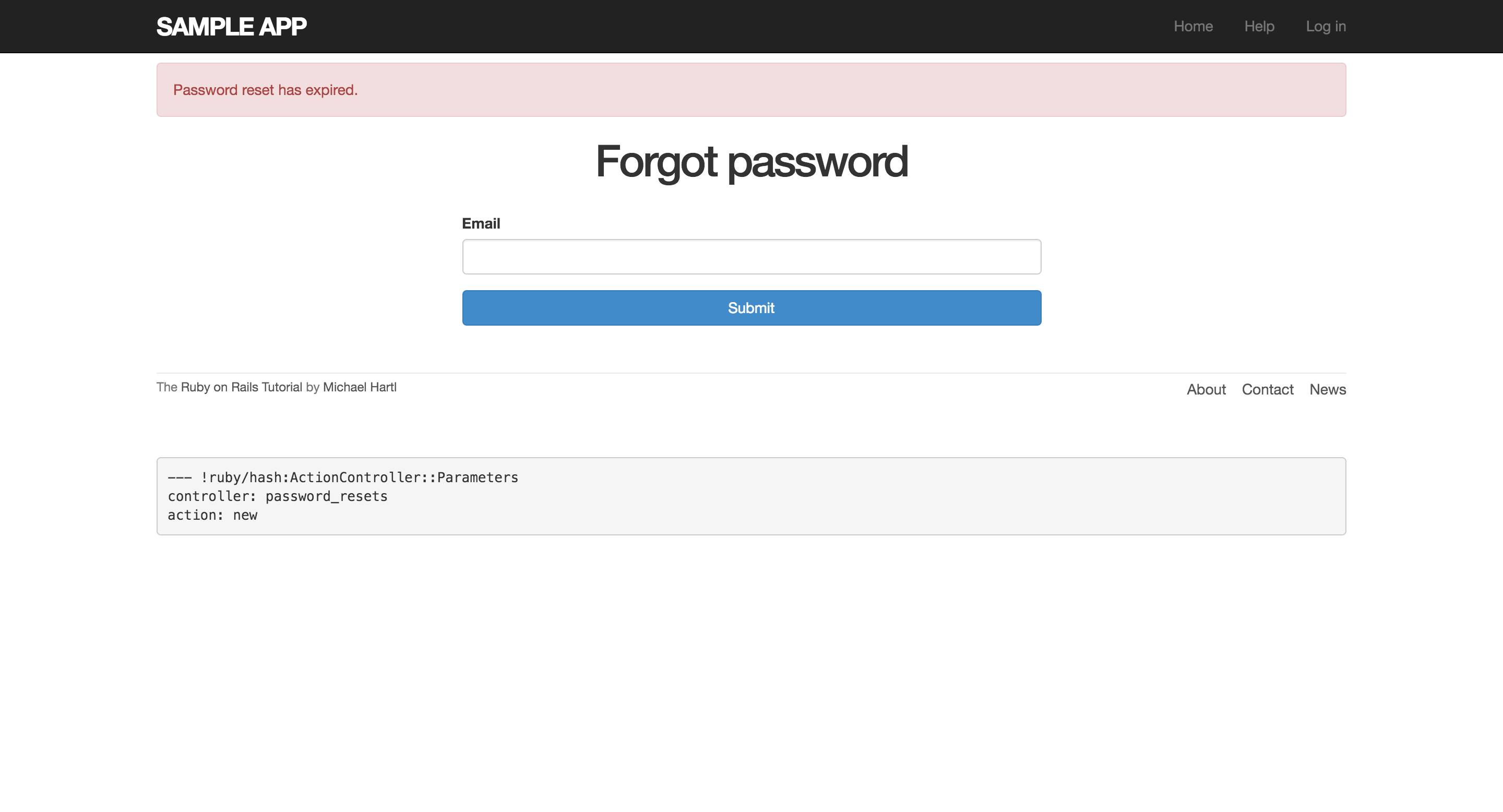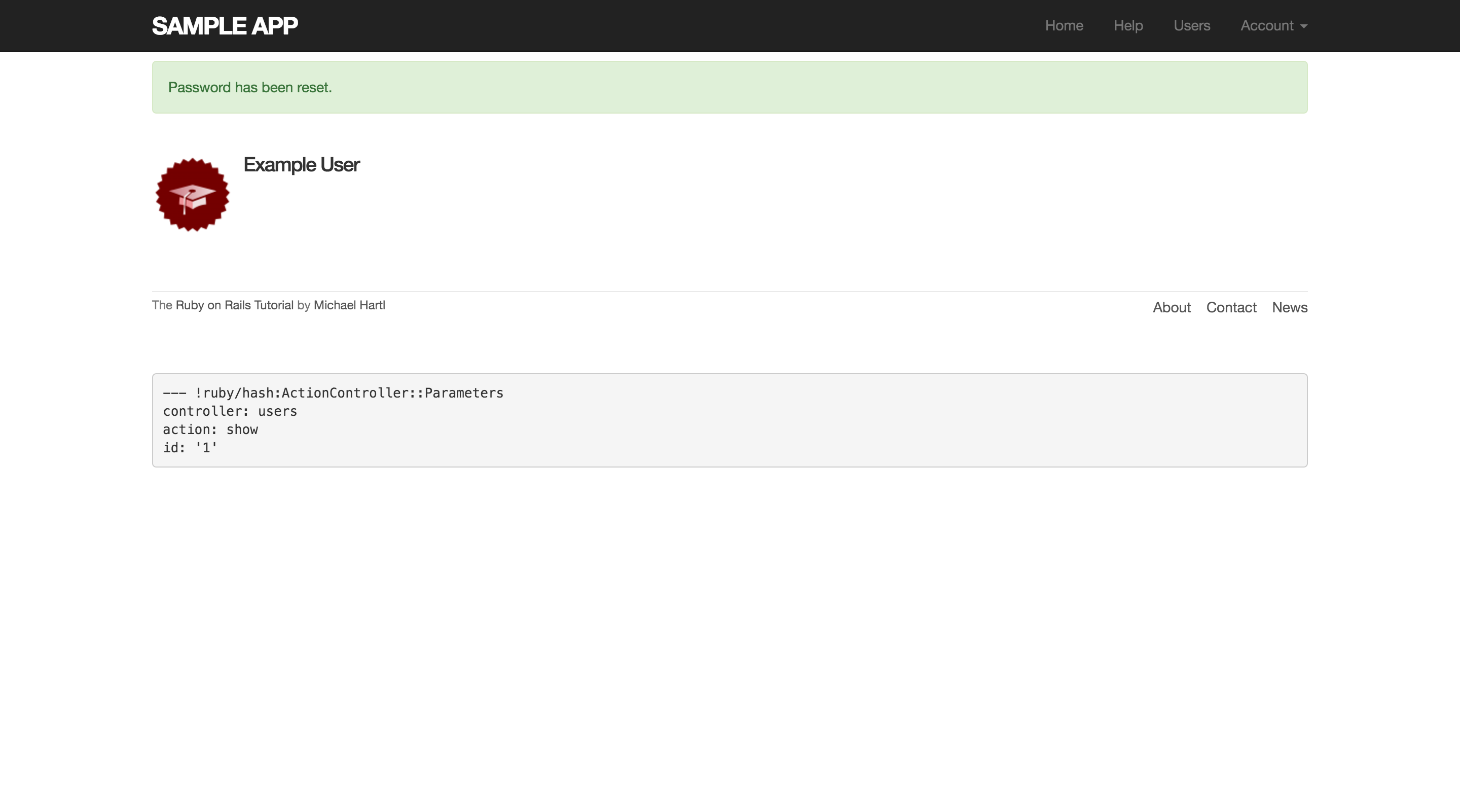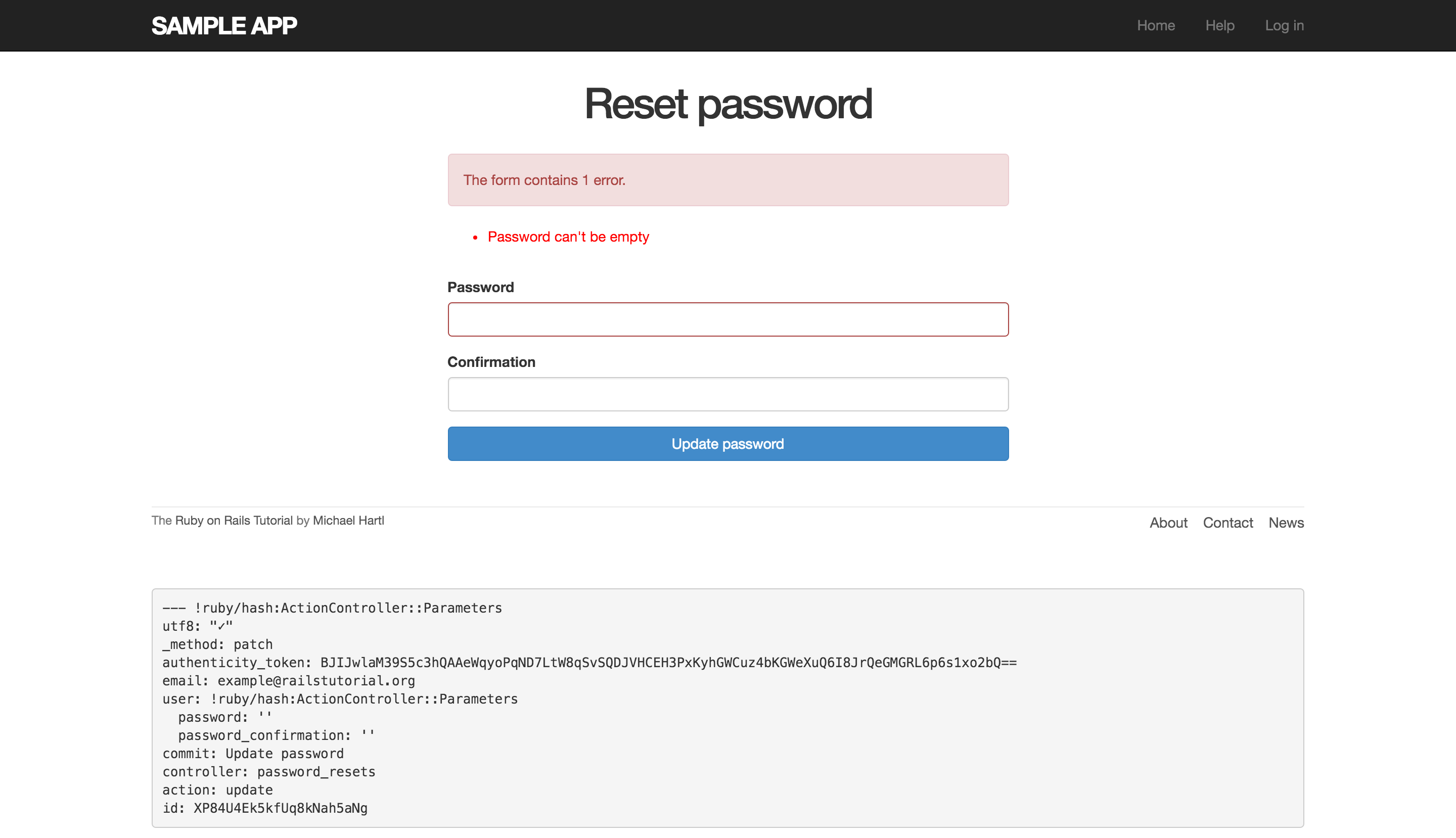 現在 update action 可以運作了,以下分別是密碼重設失敗和成功的畫面: