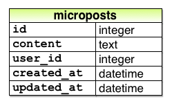 Micropost model 只需要兩個屬性,一個是 content 屬性,用來儲存 micropost 的內容,另一個是 user_id,用來聯繫 micropost 和使用者的關聯。