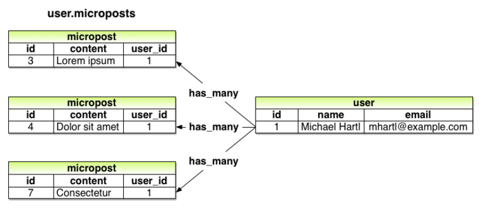 為 web APP 建立資料模型(data models)時,最基本的需求就是能夠在不同的模型之間建立關聯(associations)。在我們的例子中,每一個 micropost 會屬於某個使用者,而每個使用者則會擁有多篇 microposts,在實現這些關聯的過程中,我們會先為 Micropost model 和 User model 撰寫測試。