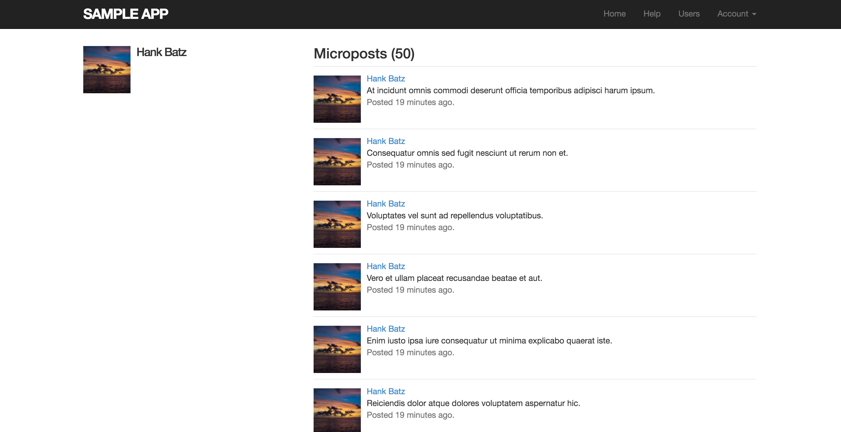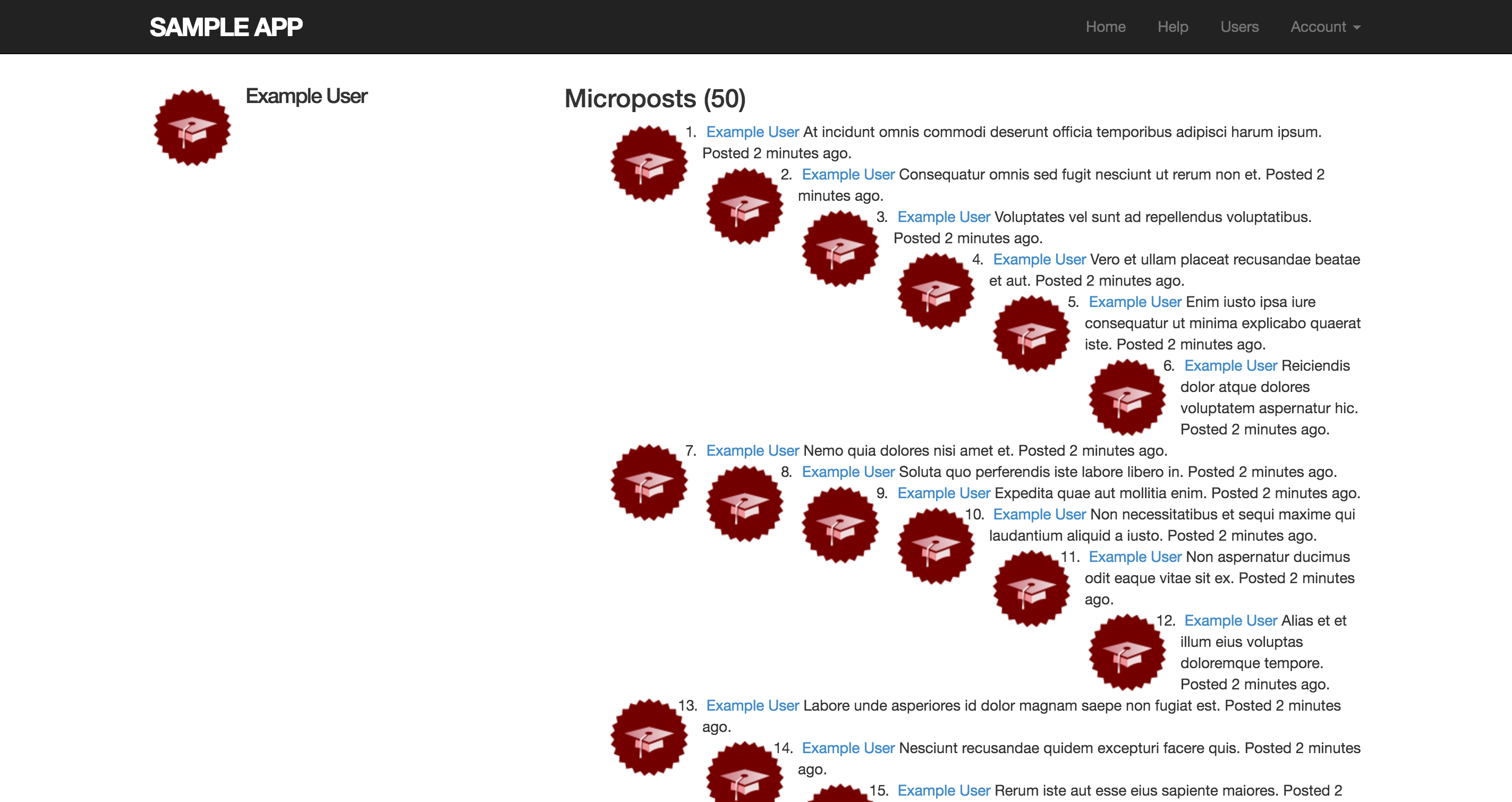 我們計畫為這六名使用者增加各 50 篇 microposts(數量要多於 30 才會分頁)。為了產生 sample content,我們會使用 Faker gem 提供的 Lorem.sentence 方法。