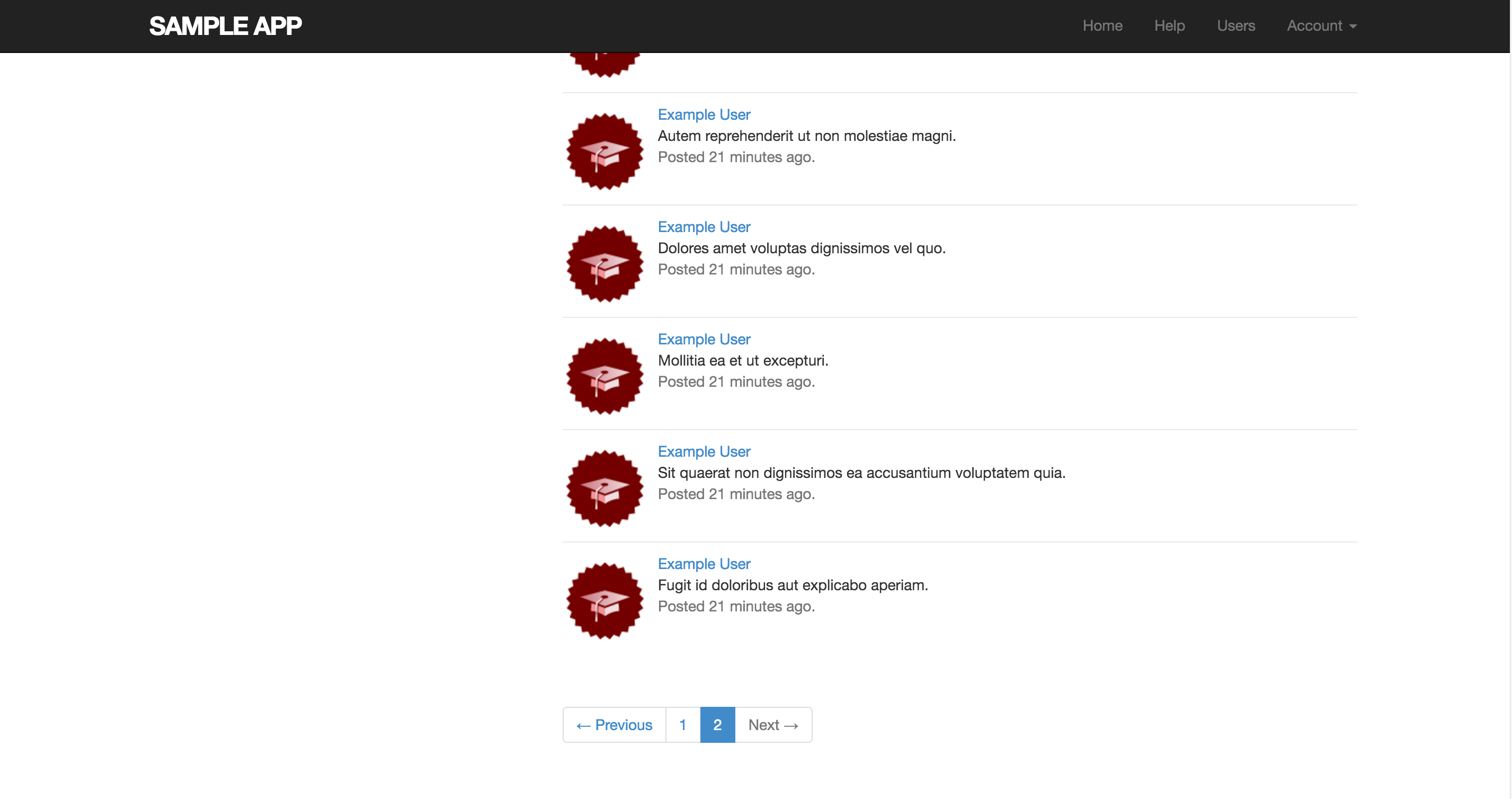每篇 micropost 都會顯示發布時間,例如「Posted 1 minute ago.」,這就是 time_ago_in_words 方法實現的結果,過一段時間再重載頁面,時間會自動更新。