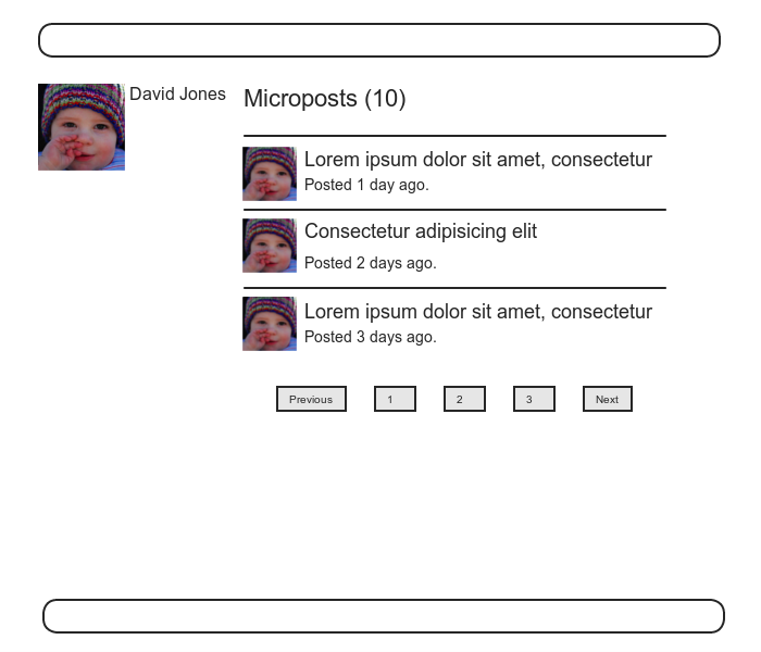 我們要按照 Twitter 的方式,不在 microposts index action 顯示使用者的 microposts,而是直接在 user show action 上顯示,mockup 如下: