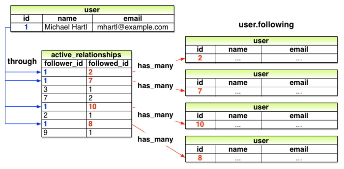 從 Figure 12.7 可以發現,獲得關注使用者的對象所需的資料都已存在於 relationships table 中(我們要參考 Listing 12.7 中實現 active_relationships table 的方式)。