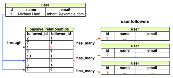 要實現的方法和實現使用者關注其他對象(followed users)的方式一樣,只要對調 follower_id 和 followed_id 的位置,以及把 active_relationships 換成 passive_relationships 即可。資料模型如 Figure 12.9 所示:
