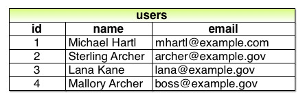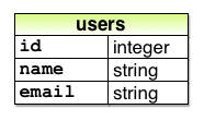 Rails 會自動幫 User model 建立一個資料表(users table),裡面就包含 name、email,其中 id 欄位是自動建立的索引:
