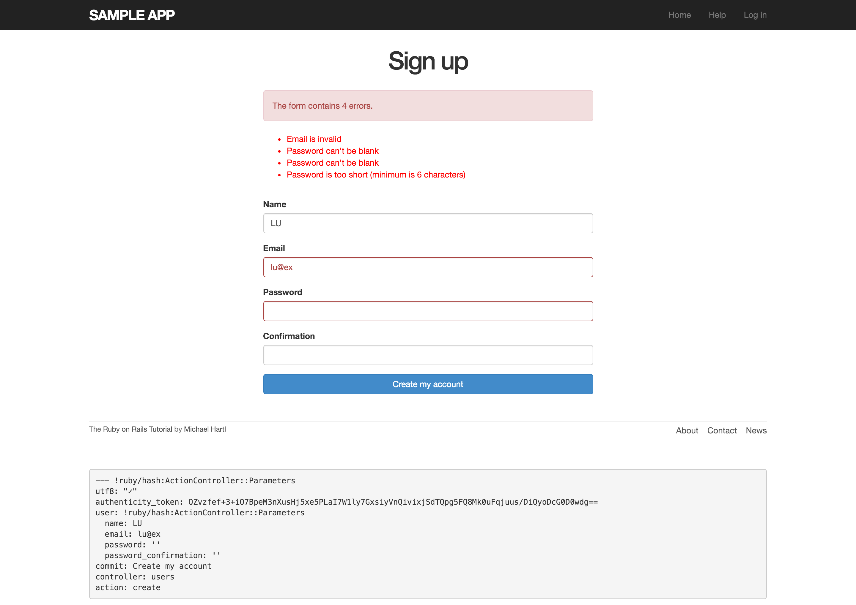 現在要加入有用的錯誤訊息,說明註冊失敗的原因。Rails 基於在 User model 驗證上,提供了這樣的訊息,例如試著提供無效的 email 和密碼,然後儲存: