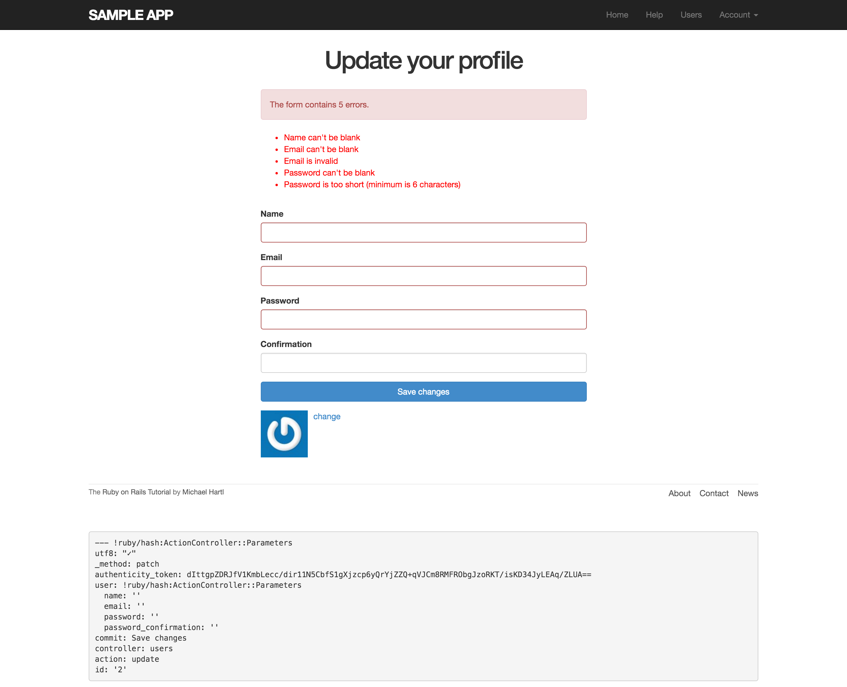 因為之前已經做好 User model 的驗證還有在編輯頁面放了 error_messages 的 patial,所以如果提交無效的編輯資料,頁面就會顯示錯誤訊息: